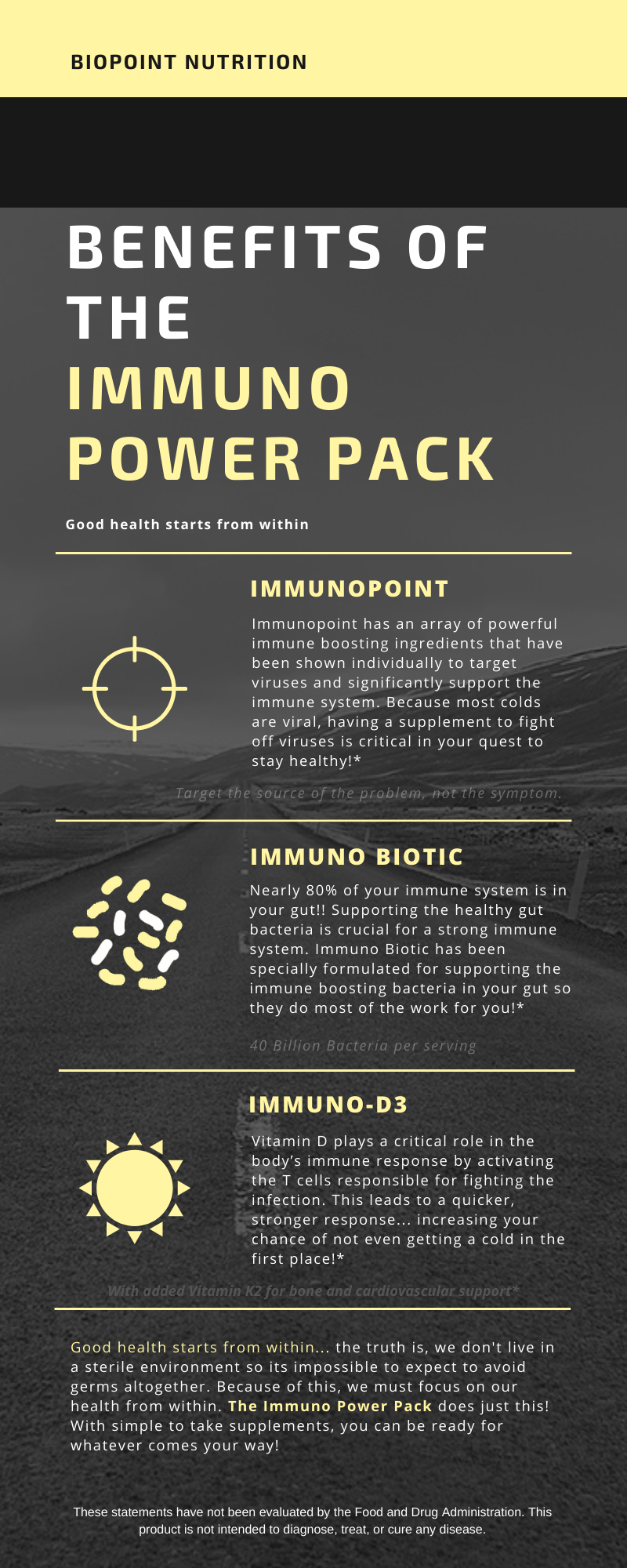 ANTIVIRAL SUPPLEMENTS: Going to the doctor for an antibiotic when you have a cold? You might as well take the money you'll spend for the copay and burn it! Being that colds are almost always viral, your doctor wont give you an antibiotic for one. If he does, it most likely won't do anything... But what about antiviral supplements? Have you looked at the ingredients in Immunopoint? There are some pretty powerful ingredients in there that have been shown individually to have strong antiviral properties as well as supporting your immune cells like Elderberry and Black Seed... That's why we use them!