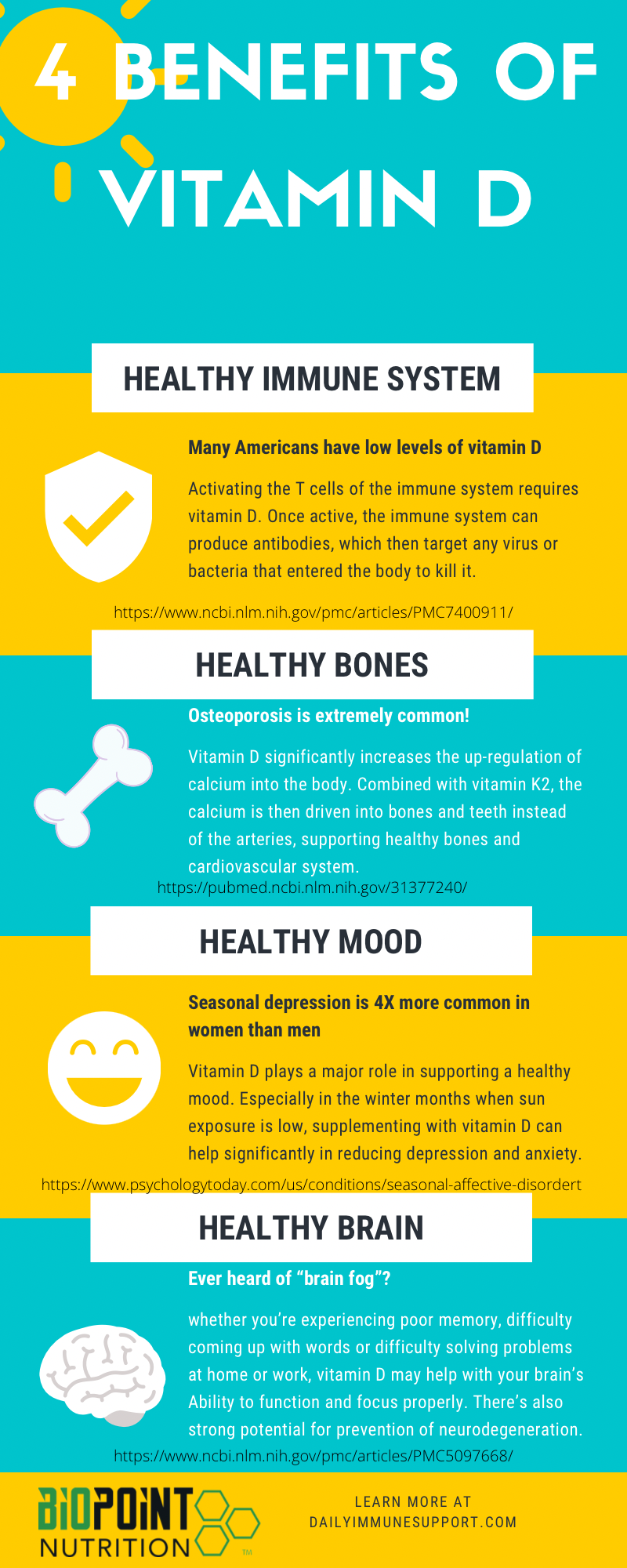 It's well known in the medical community that vitamin D is beneficial for improving your mood, energy, bone integrity and even weight loss... But did you know that it's also extremely beneficial for bolstering your immune system?! A more robust immune response means a quicker, stronger, more efficient reaction to the virus... The end result... more time doing what you want instead of laying in bed.