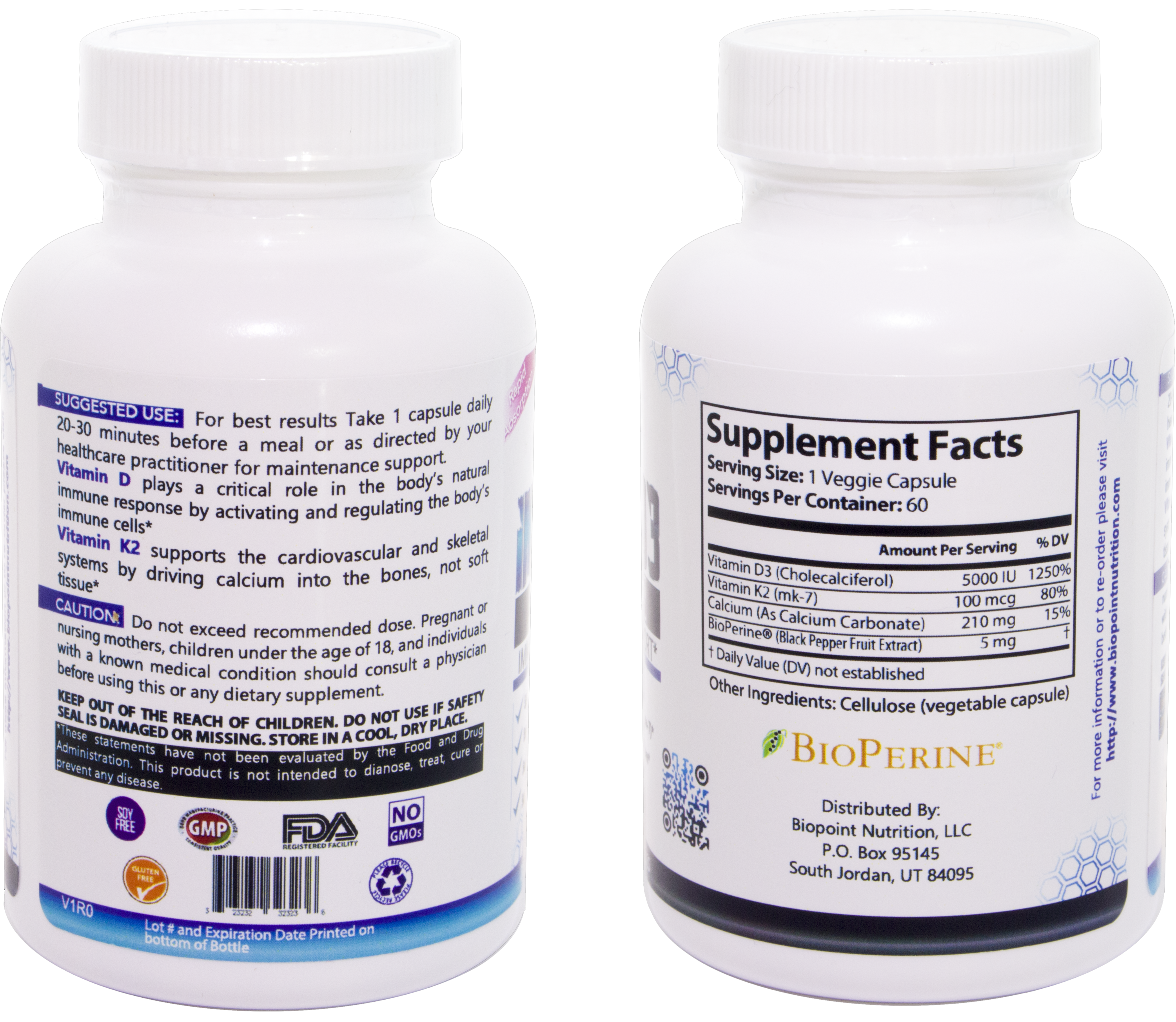 • BONUS: Added Vitamin K2 - Why? Because vitamin K2 along with Vitamin D3  will drive calcium into the hard tissue (Bone and Teeth), instead of the soft tissue (arteries and muscles)... So how does this benefit you? This supports your cardiovascular system and helps with bone integrity, all while supporting a healthy immune system... all of that with just one pill a day... Pretty impressive!!